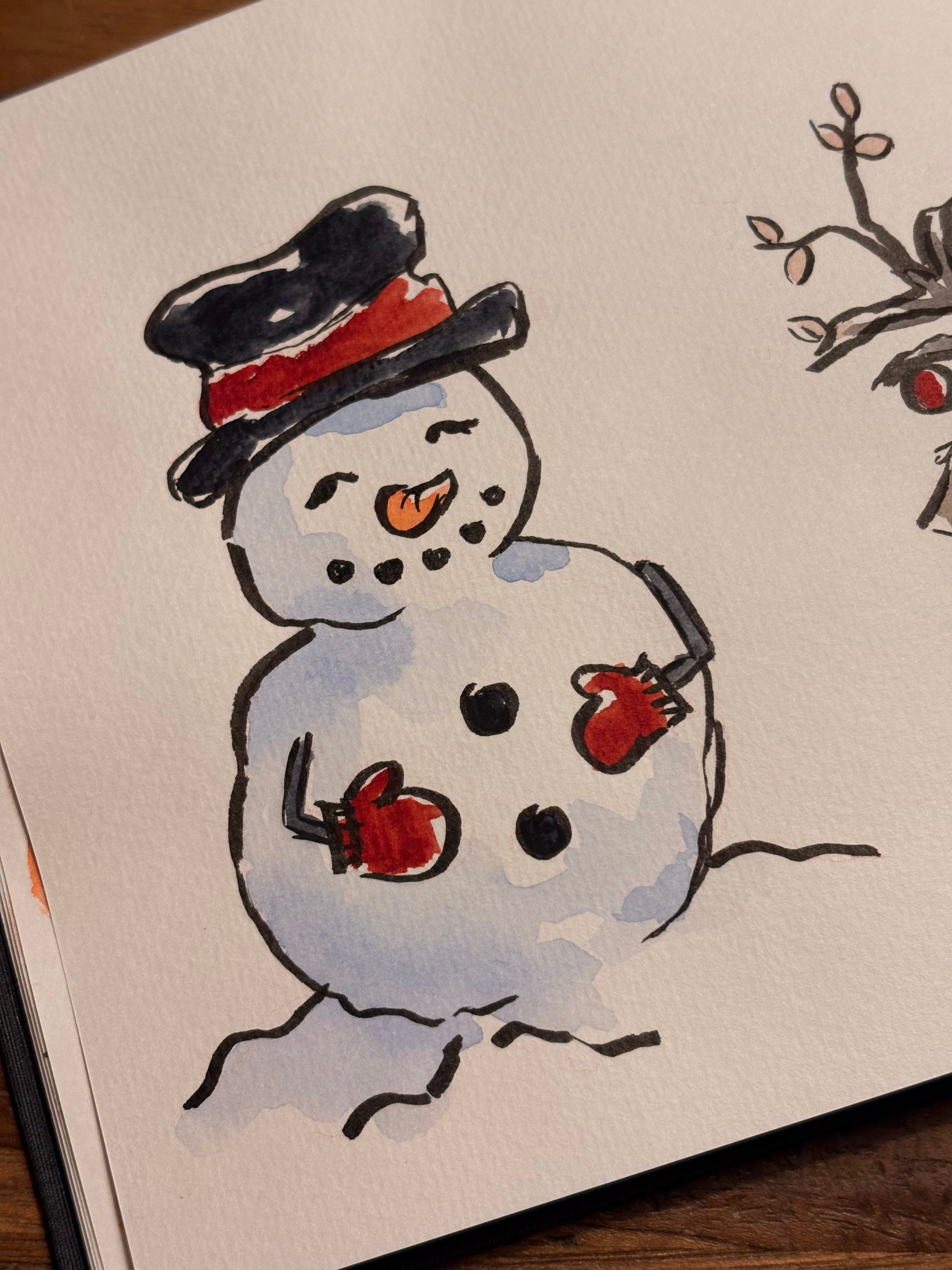 We beginnen met simpele ronde basisvormen en bouwen daarmee een schattige sneeuwpop op. Je leert hoe je met een brushpen snel een speels, levendig effect toevoegt aan je illustratie.